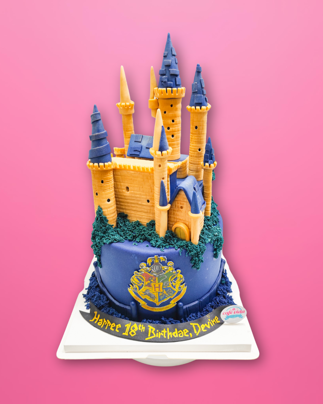 A magical two-tier cake shaped into a towering castle, complete with turrets and the Hogwarts crest for fans of fantasy adventures. Moist layers inside make it not just a showstopper, but a delicious one too—perfect for grand birthday celebrations.