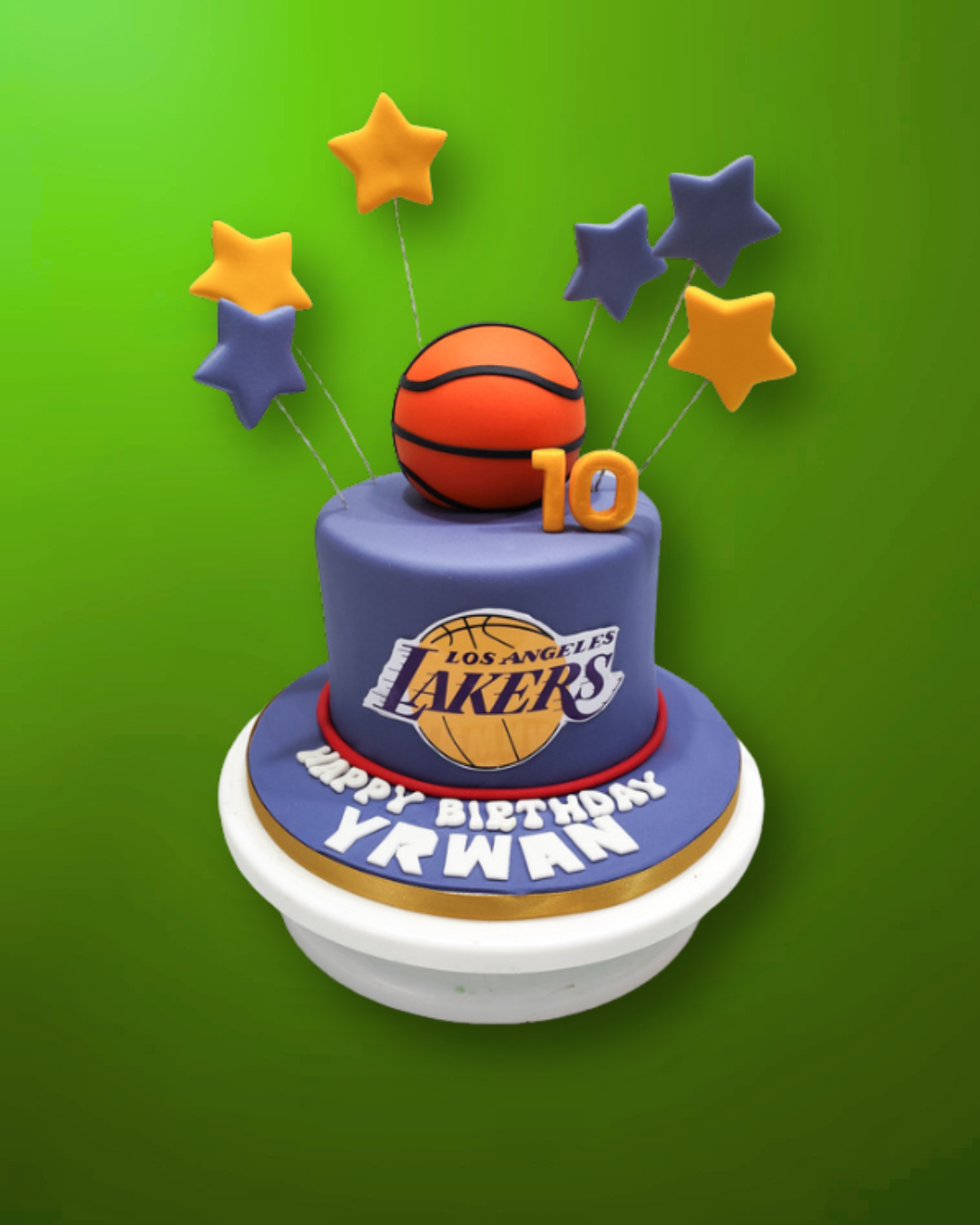 For the ultimate Lakers fan, this bold purple-and-gold cake comes with a basketball topper, fondant stars, and the iconic Lakers logo. Delicious cake layers inside make it a slam dunk for birthday celebrations.