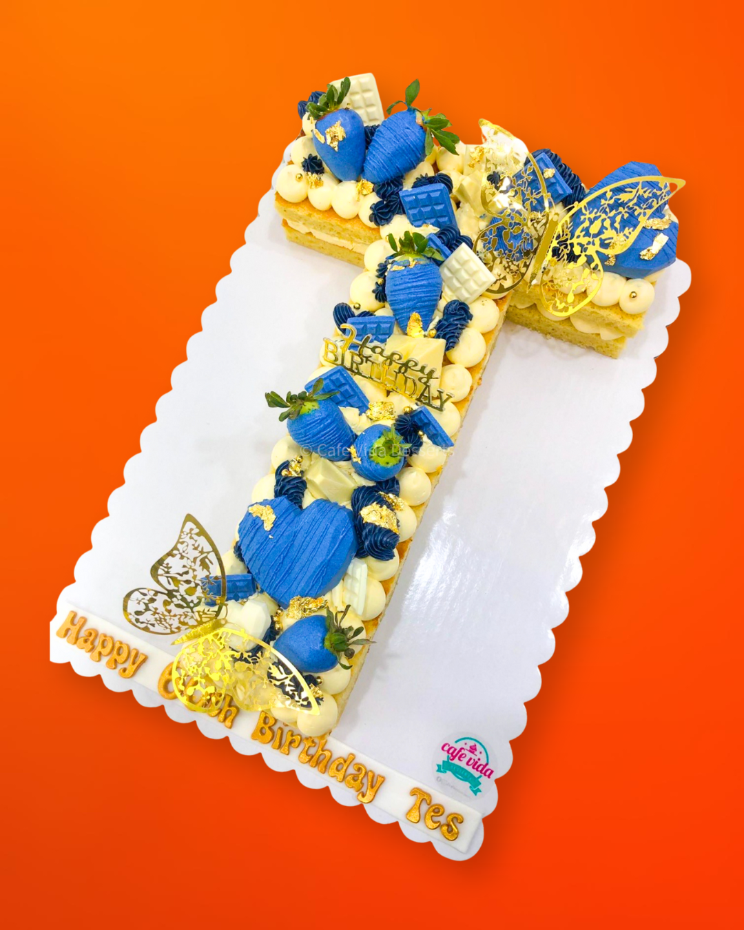 Elegant and bold, this monogram cake is adorned with blue buttercream swirls, golden accents, and dipped strawberries. Ideal for milestone birthdays or anniversaries, it blends moist sponge layers with a rich, creamy filling for a luxurious flavor experience.