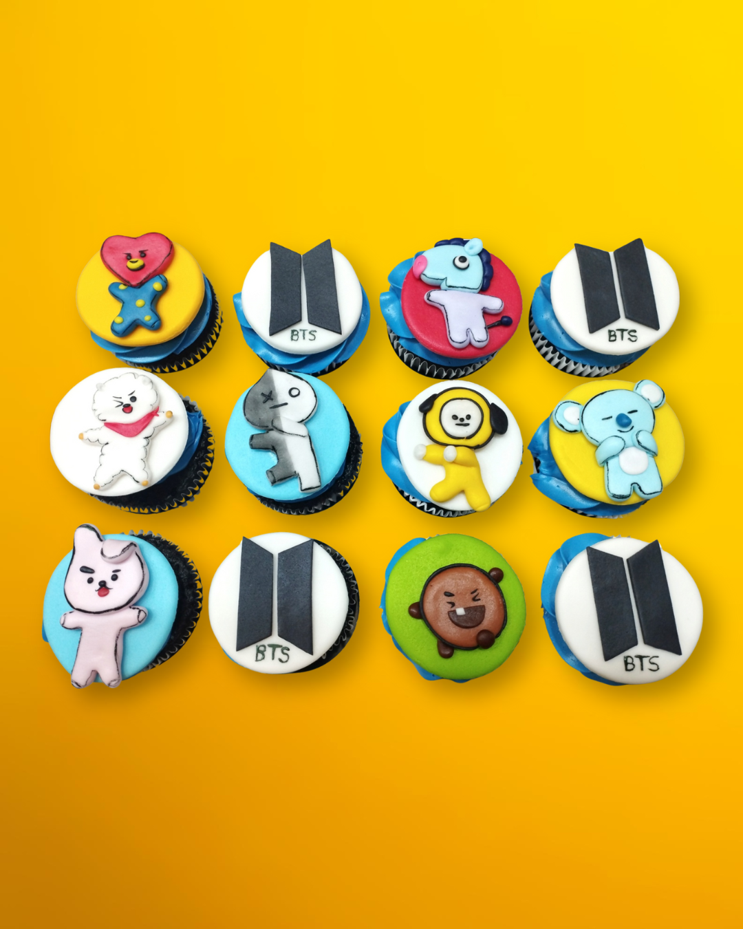 A dozen cupcakes topped with BT21 characters and BTS logos, perfect for sharing at fan gatherings or birthdays. Fluffy cupcakes with customizable flavors like chocolate, vanilla, or red velvet, topped with vibrant fondant details.