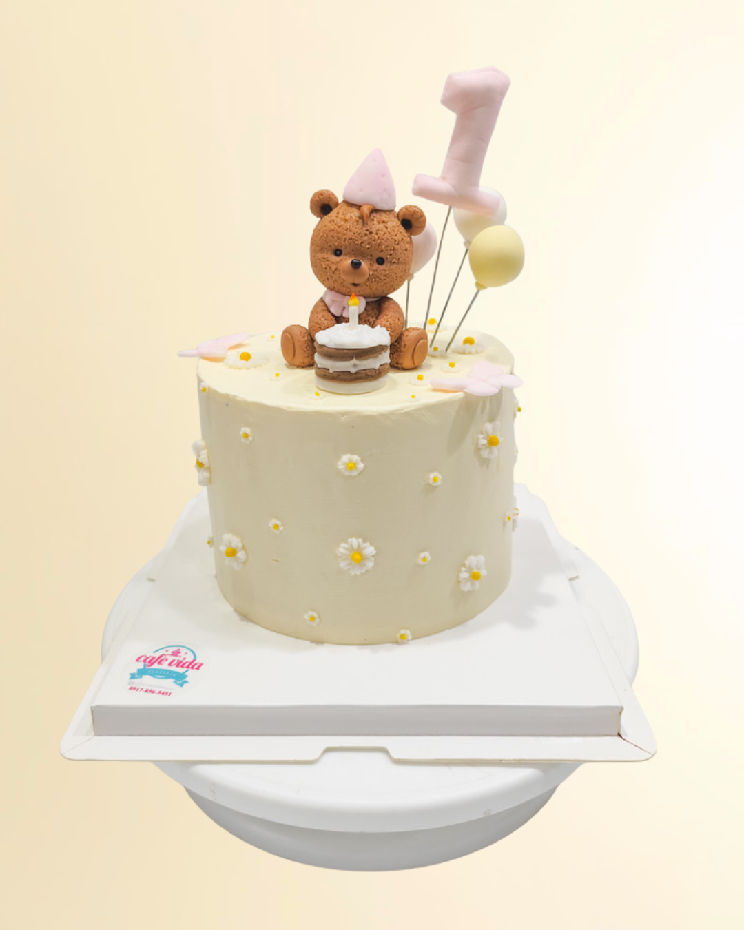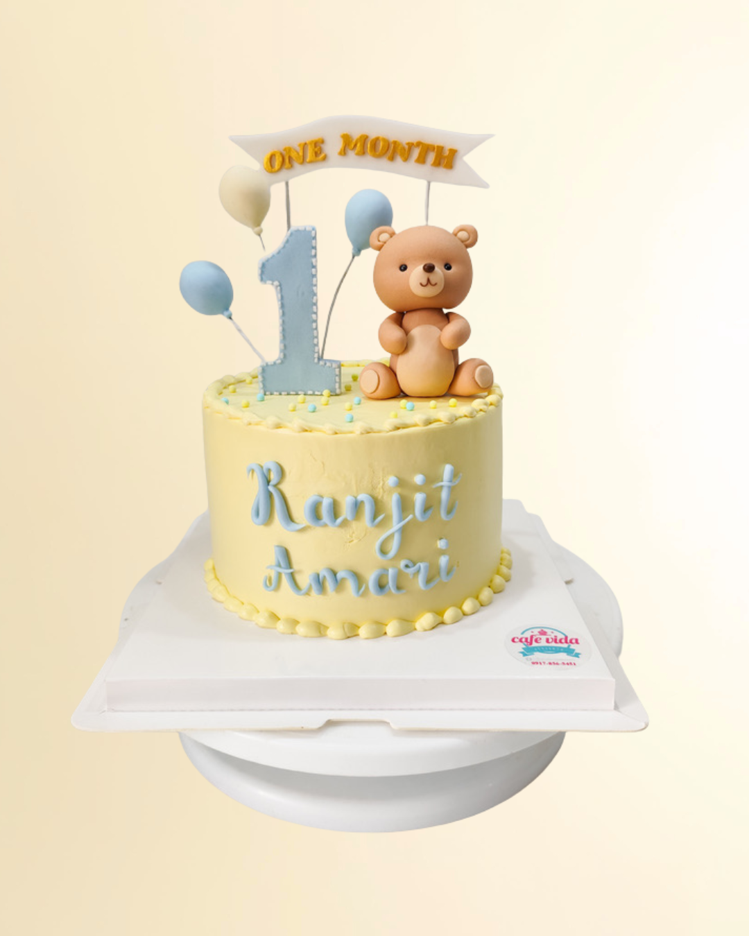 A sweet pastel yellow cake topped with a fondant teddy bear, balloons, and a banner marking baby’s first month. Soft, fluffy cake layers with light cream filling make this design as delicious as it is charming.