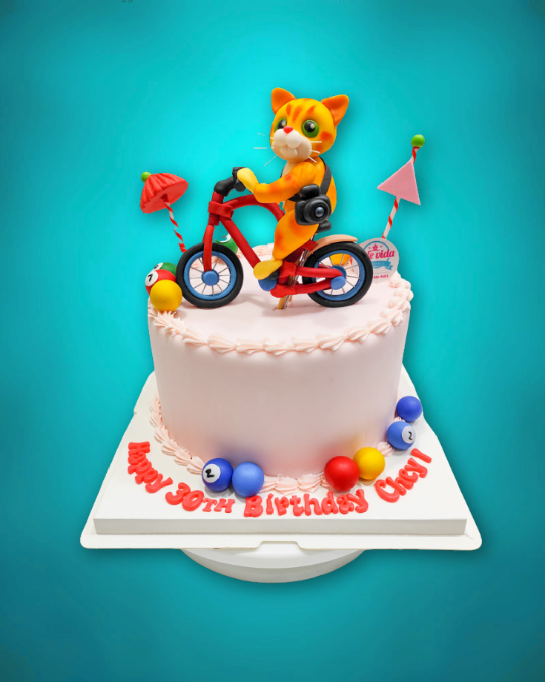 Quirky and full of personality, this cake features a fondant cat riding a bicycle with playful accessories. Whimsical details meet moist sponge layers inside, making it a lighthearted centerpiece for milestone birthdays.