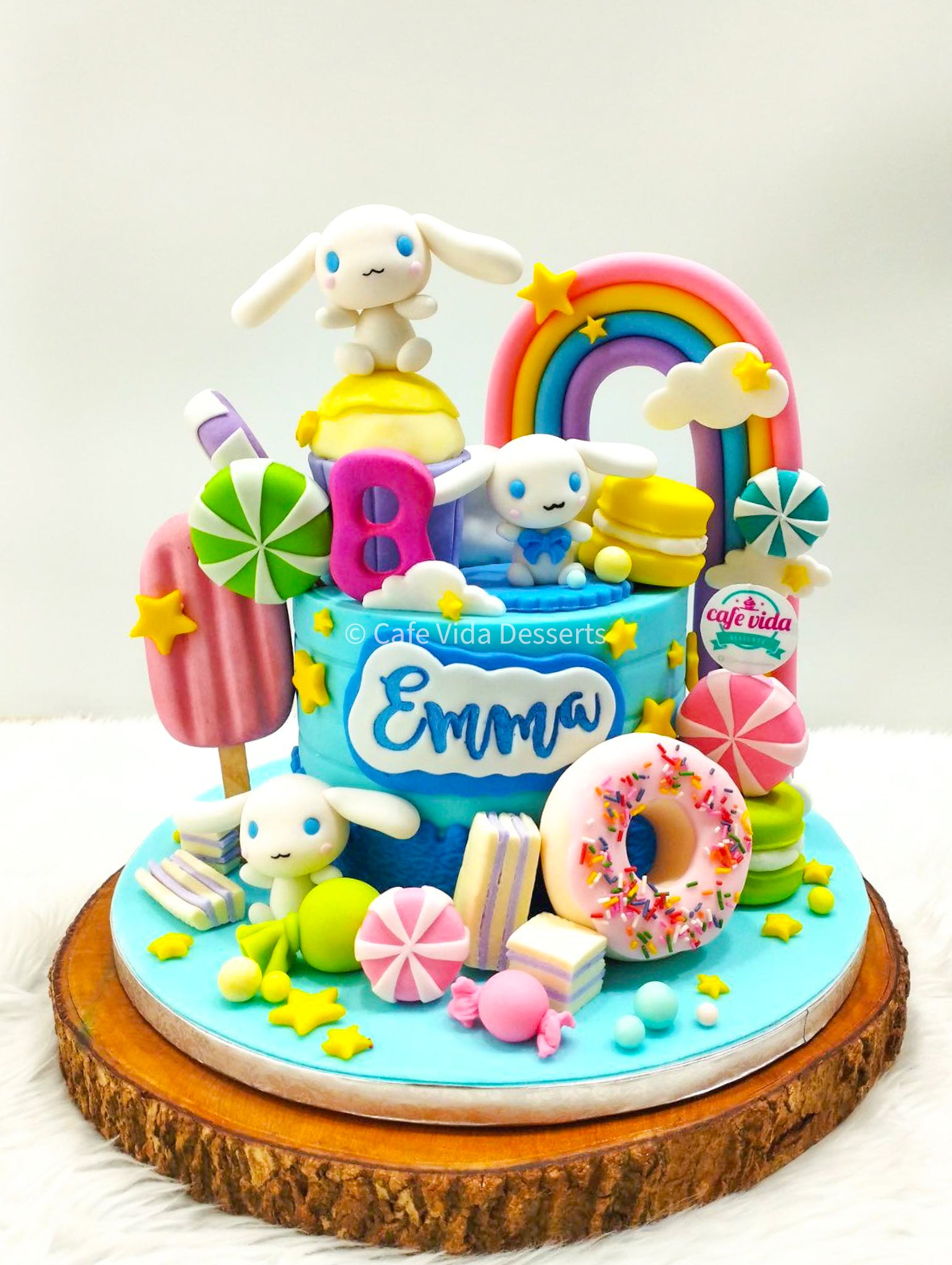 Indulge in a whimsical journey through confectionery wonder with our enchanting cake design featuring the beloved Cinnamoroll having fun under a vibrant rainbow in a Candyland paradise.