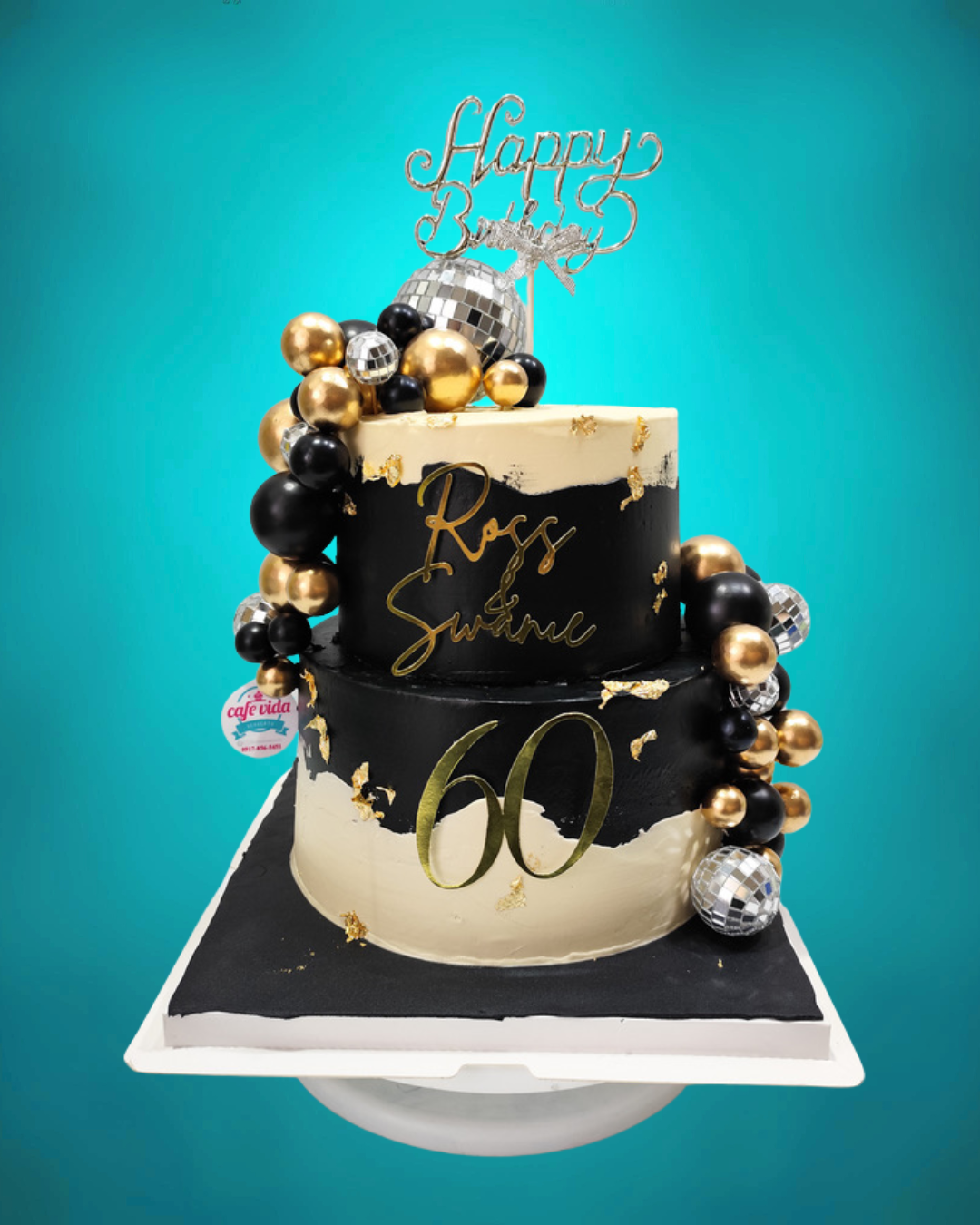 A bold and stylish two-tier cake in black and gold, decorated with fondant balloons and mini disco balls for that party feel. The rich sponge and buttercream filling inside complement the sleek, modern look outside—perfect for celebrating 60 years in grand style.