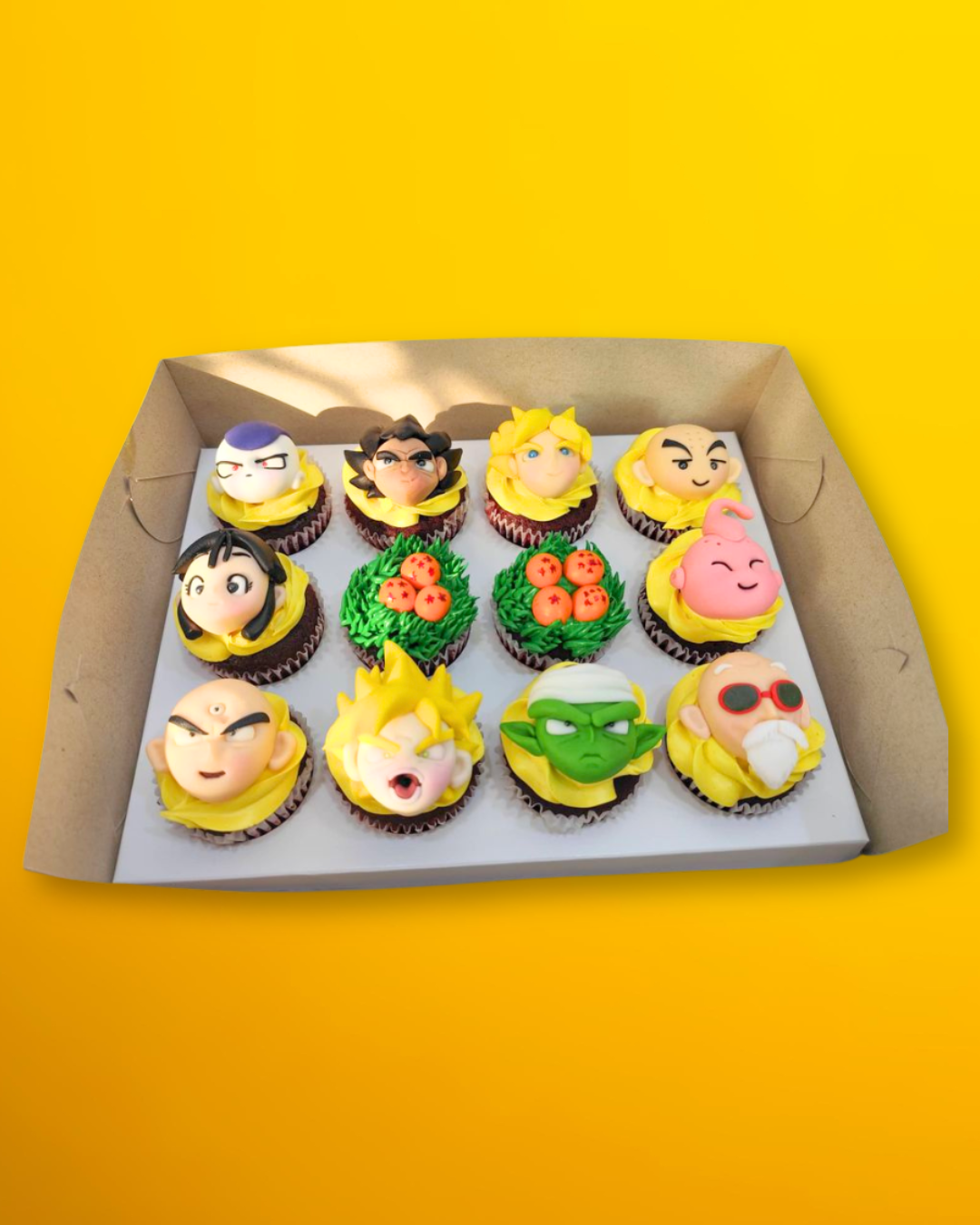 Unleash your power level with Dragon Ball Z cupcakes featuring Goku, Vegeta, Piccolo, and more in 3D fondant toppers. A bold and exciting set for anime fans, with delicious cupcake bases underneath.