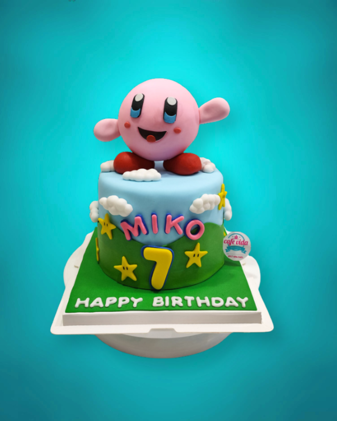 Bright and cheerful, this Kirby-themed cake features the beloved pink character surrounded by stars and clouds, perfect for kids who love gaming adventures. Fluffy cake layers with creamy filling make it a birthday treat to remember.