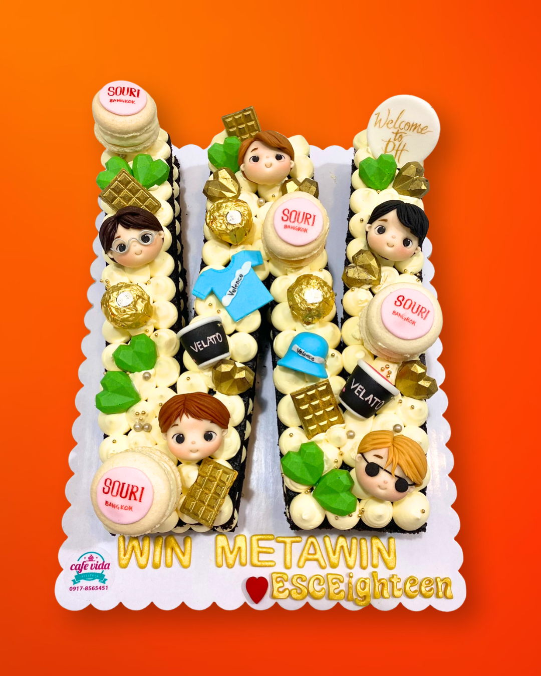 Designed for superfans, this monogram cake features edible fondant characters, chocolates, macarons, and golden accents inspired by pop culture favorites. Great for birthdays and fan gatherings, the cake layers are soft and moist, perfectly paired with smooth buttercream for a flavor that matches the fun design.