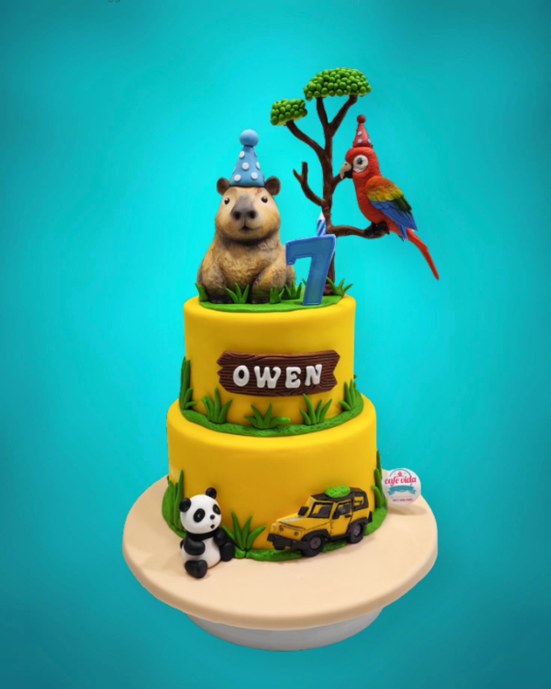 Perfect for animal lovers, this jungle-themed two-tier cake is decorated with a fondant capybara, parrot, panda, jeep, and lush greenery. A fun adventure on every tier, paired with a light sponge and smooth cream filling for a treat as wild as the design.